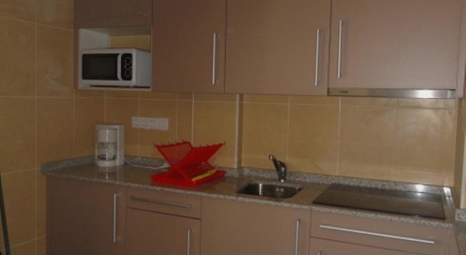 with a kitchenette with a hob, oven and microwave, as well as a washing machine.